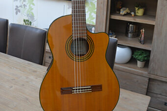 Konzertgitarre: Die Saiten einer Konzertgitarre bestehen aus Nylon. Für kleinere Gitarristen und als Schülergitarre werden kleinere Bauformen angeboten.